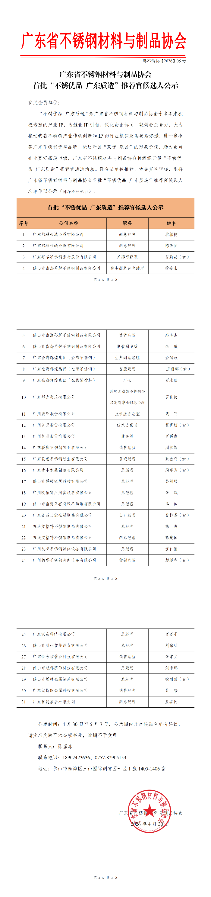 4月21日,广东省不锈钢材料与制品协会秘书长黄耿燕、副秘书长彭剑一行走访了会员单位佛山市中祥联钢业有限公司,受到郑经纬总经理的热情接待。座谈中,郑经纬总经理向黄耿燕秘书长一行介绍了企业的主营业务及经营理念。据郑总介绍,中祥联专注于201、304及部分400系不锈钢分条料细分产品,属于小众领域,拥有稳定的客户群体。郑总表示,企业要实现长远发展,必须做好风险把控,坚持诚信经营。黄耿...