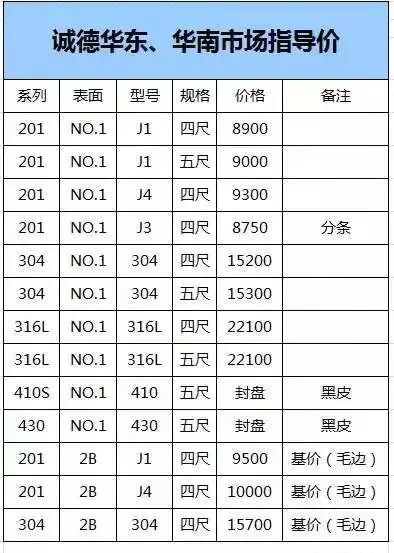 佛山、无锡、山东、福建201:四尺9200 ;304 四尺/15600(201下调100,304平盘)