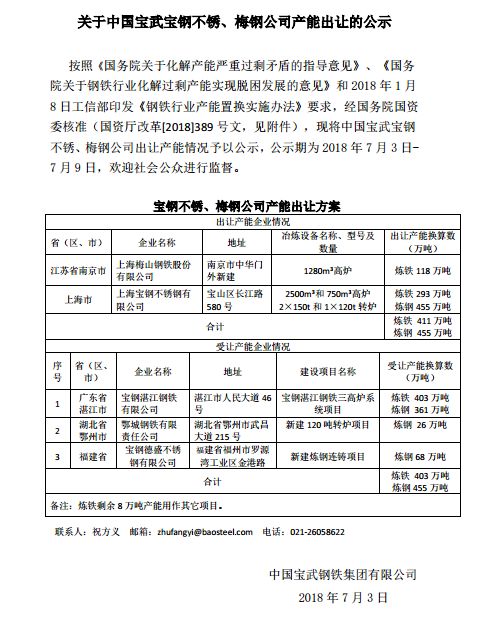 据宝武集团消息,近日,其发布公告称《中国宝武宝钢不锈、梅钢公司出让产能公示》于2018年7月3日发布,原公示截止日为2018年7月9日,现将公示截止日期延长至2018年7月30日。