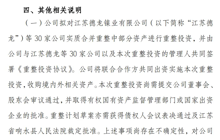 公告称,公司拟对江苏德龙镍业有限公司(以下简称"江苏德龙")等30家公司实质合并重整中部分资产进行重整投资,并由公司与江苏德龙等30家公司以及本次重整投资的管理人共同签署《重整投资协议》。公司将联合合作方共同出资实施本次重整投资,收购境内外相关资产。本次重整投资尚需提交公司董事会,股东会审议通过,并取得有权国有资产监督管理部门或国家出资企业的批准。重整计划草案亦需获得债权人会议表决通过及江苏省响水县人民法院裁定批准。上述事项尚存在不确定性,对公司当期及未来财务状况的影响有待进一步评估确定,公司将及时披露有关事项的进展情况。