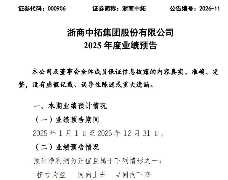 1月29日,浙商中拓发布2025年度业绩预告称,报告期内,公司预计实现归属于上市公司股东的净利润1.65亿元至2.30亿元,同比下降37.64%至55.27%;扣除非经常性损益后的净利润预计亏损1.50亿元至2.15亿元,亏损同比扩大。