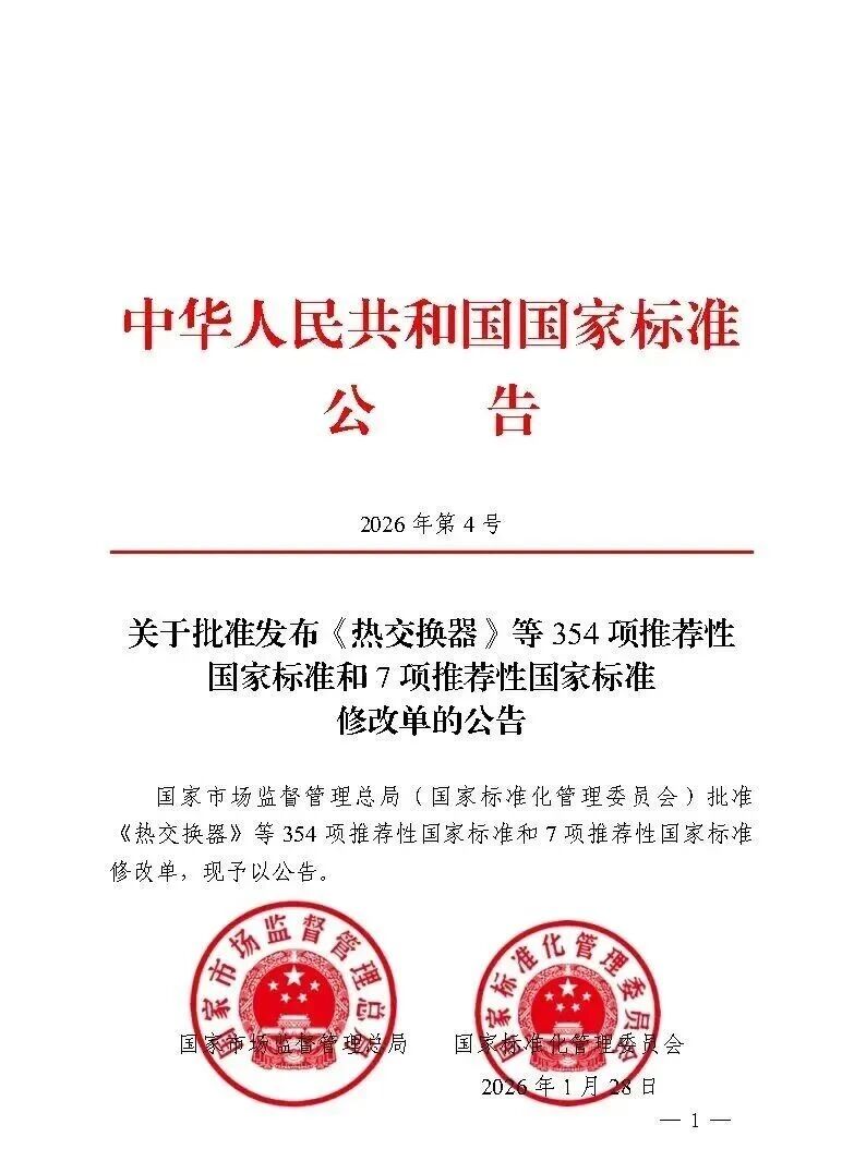 广东省不锈钢材料与制品协会注意到,GB/T151-2026《热交换器》于2026年1月28日发布、8月1日实施,该国家标准替代2014版。