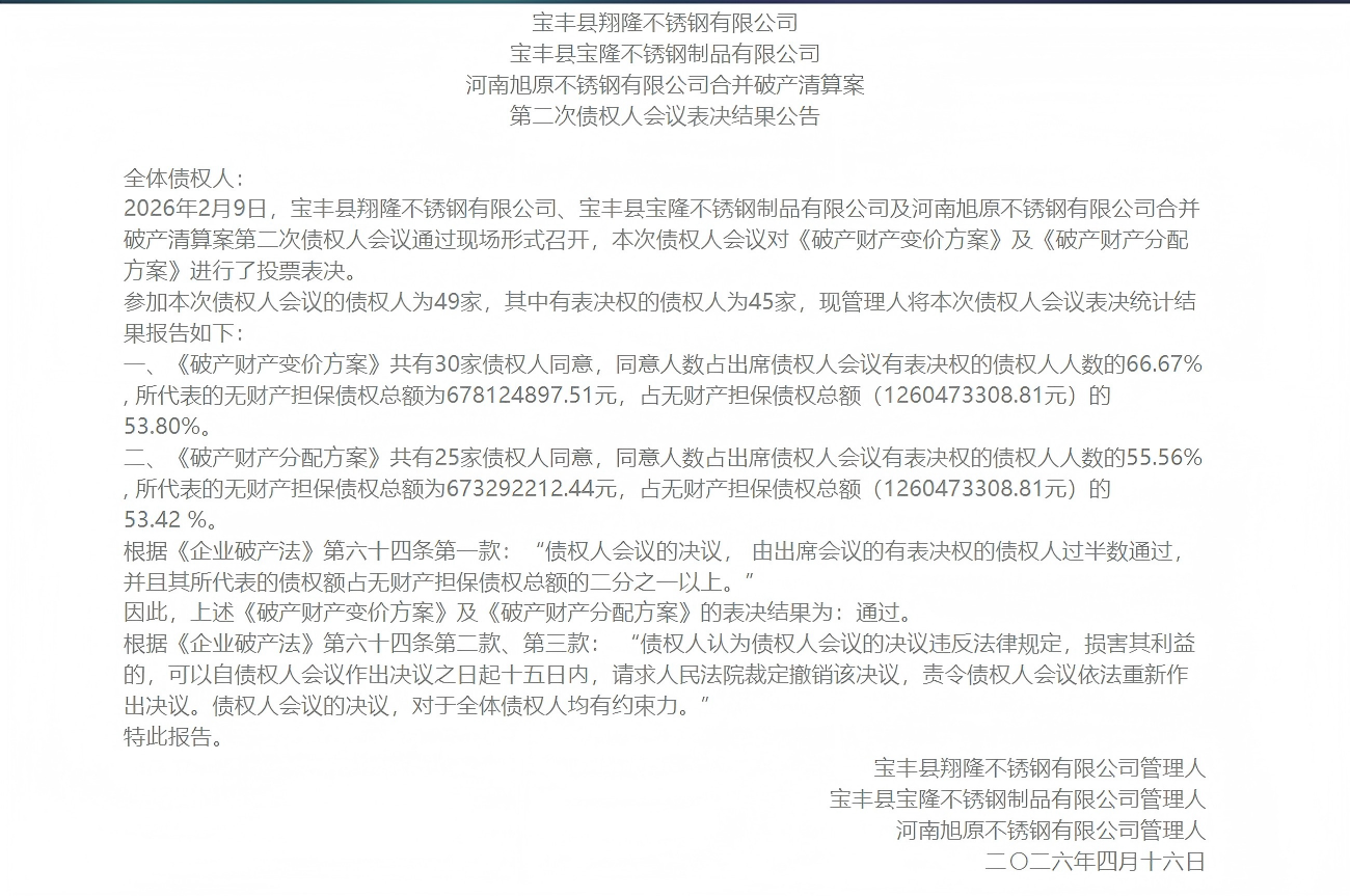 广东省不锈钢材料与制品协会获悉,4月16日,宝丰县翔隆不锈钢有限公司、宝丰县宝隆不锈钢制品有限公司、河南旭原不锈钢有限公司合开破产清算案第二次债权人会议表决结果公告发布,具体如下: