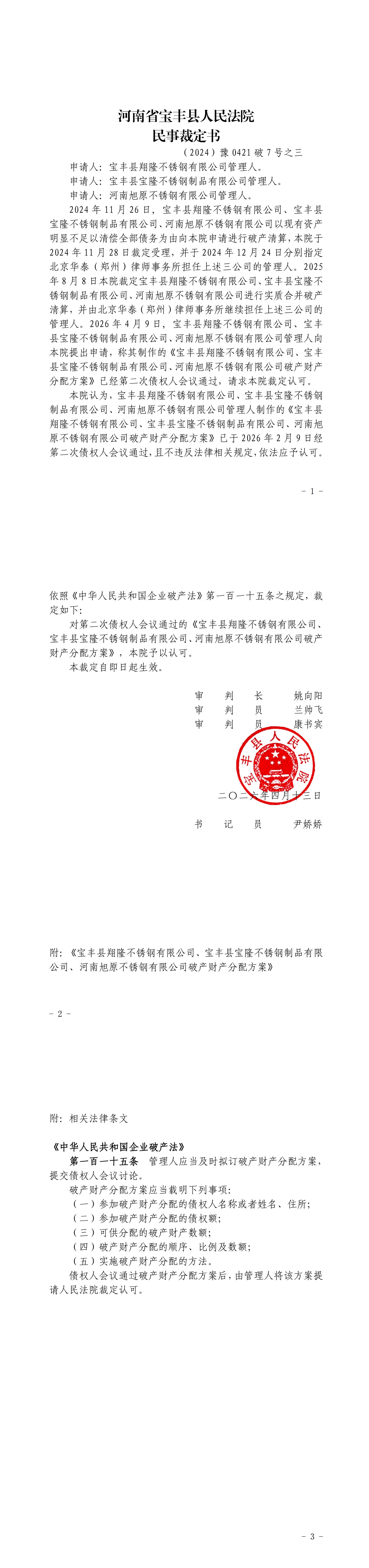 财产分配方案出炉!河南3家大型不锈钢企合并破产清算案→