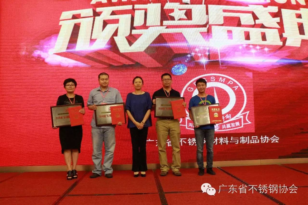 为推进广东省不锈钢行业品牌建设,我会在今年3月份启动了“第二届广东不锈钢品牌企业”公益评选活动。此次评选活动较第一届规格、要求更高,协会联合民营经济报社共同主办,经会员企业申报、秘书处初选、专家评审、网络投票及终审等阶段,评选出了2014年度广东不锈钢新锐品牌企业、2014年度广东不锈钢贸易品牌企业、2014年度广东不锈钢装饰板品牌企业、2014年度广东不锈钢冷轧品牌企业、2014年度广东不锈钢制管十佳品牌企业、2014年度广东最具品牌价值不锈钢制管领军企业等6大奖项,光丰集团、海利集团、广东外贸开发公司等33家企业荣获殊荣。