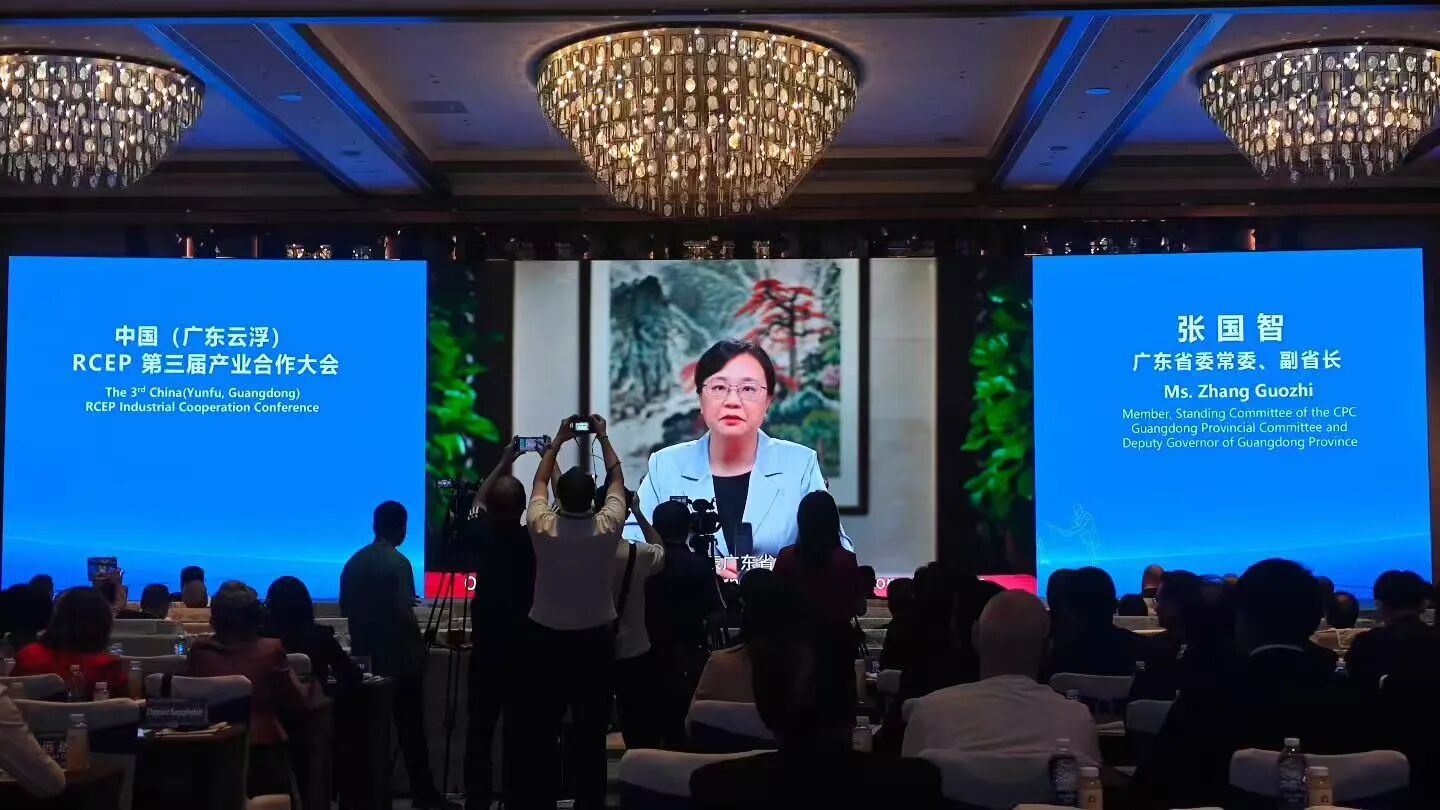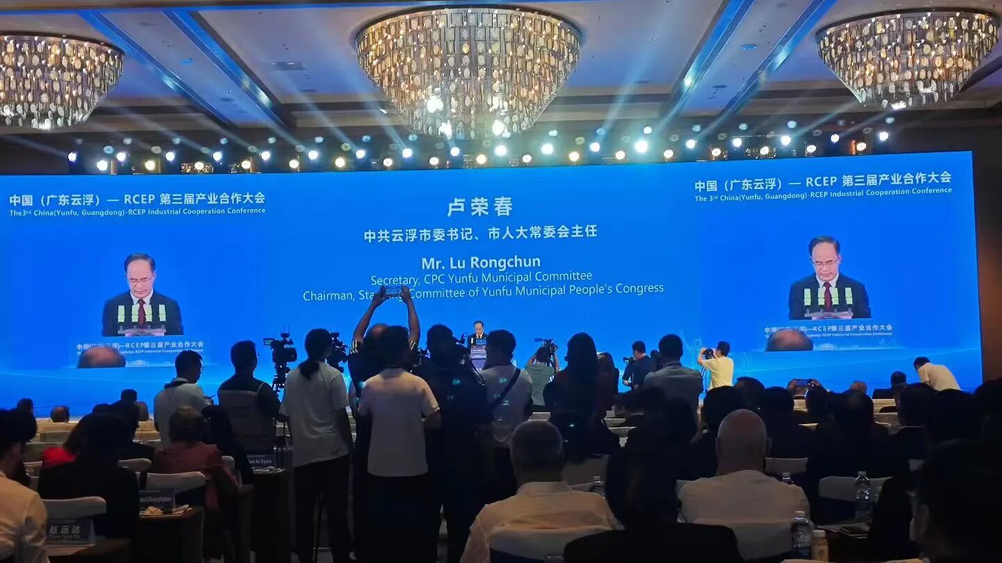 10月17日下午,由云浮市人民政府、广东省商务厅、RCEP产业合作委员会共同主办的中国(广东云浮)-RCEP第三届产业合作大会在云浮市新兴县开幕。大会以“拓展RCEP产业合作、塑造开放开发新优势”为主题,邀请包括RCEP14个成员国政府官员、行业商协会代表在内的500多名海内外嘉宾齐聚一堂,共商合作大计、共绘发展蓝图。广东省委常委、副省长张国智向大会发来祝贺视频。云浮市委书记、市人大常委会主任卢荣春,RCEP产业合作委员会主席许宁宁,商务部国际贸易经济合作研究院“一带一路”经贸合作研究所所长祁欣,柬埔寨商业部国务秘书克里斯托夫·切昂,越南驻华大使馆商务参赞农德莱,韩国中华总商会会长袁国栋,泰-中商务委员会秘书长庄介湘等领导和嘉宾出席大会并致辞。云浮市委副书记、市长李庆新,市政协主席梁丽娴,市委副书记杨骁婷出席大会。