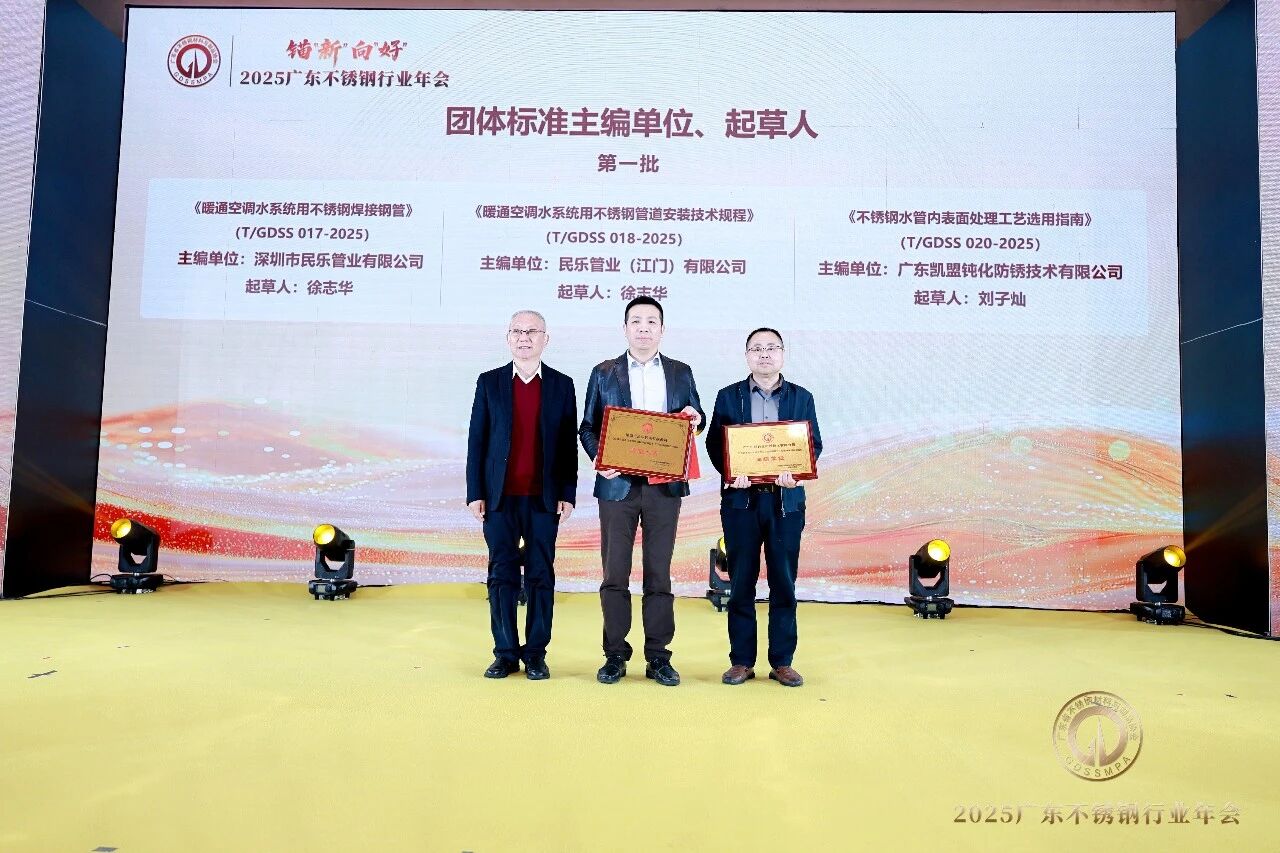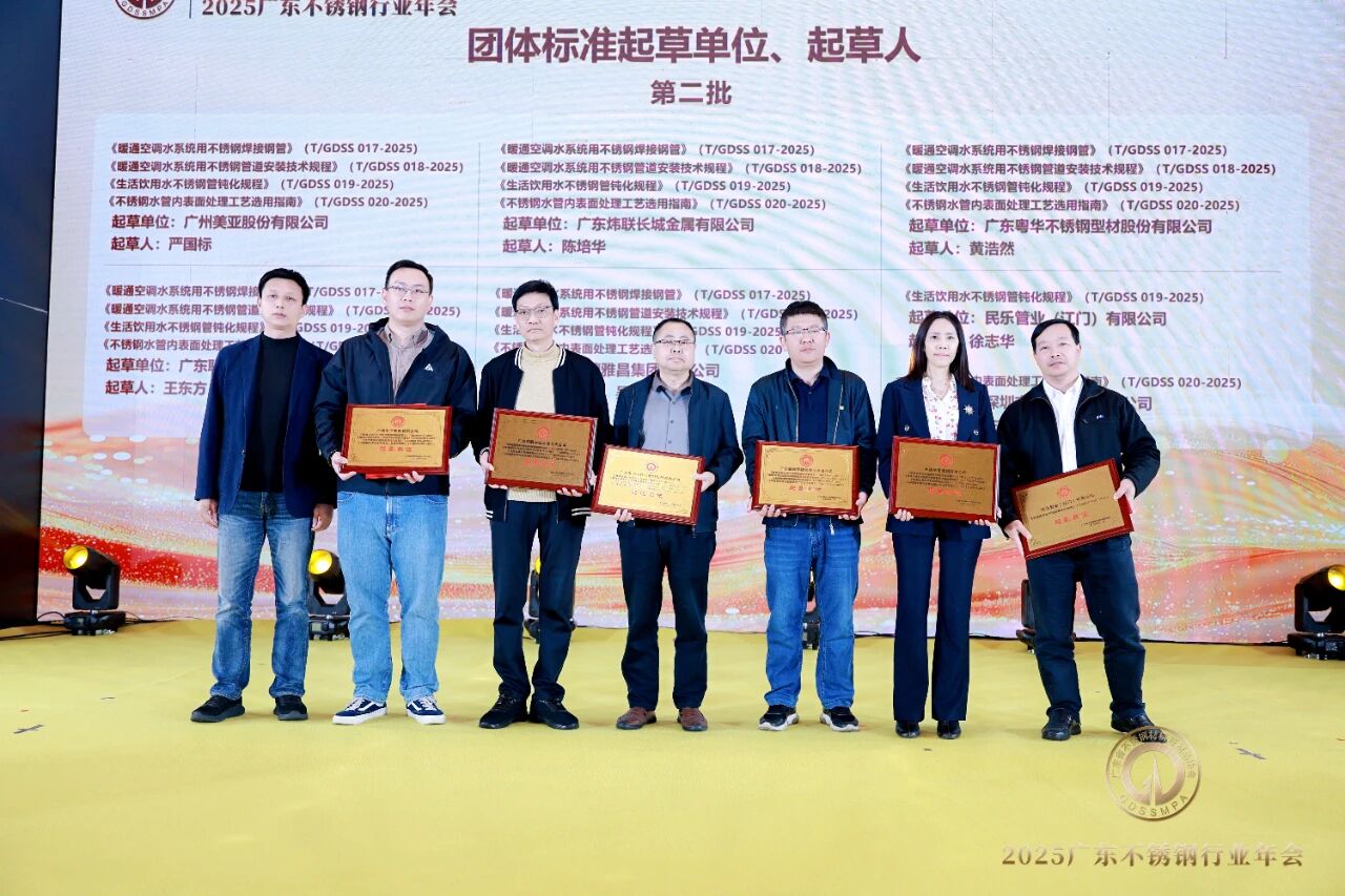 2025年,广东省不锈钢材料与制品协会成功发布《暖通空调水系统用不锈钢焊接钢管》《暖通空调水系统用不锈钢管道安装技术规程》《生活饮用水不锈钢管钝化规程》《不锈钢水管表面处理工艺选用指南》等四项团体标准。大会为标准起草单位、起草人、审查人颁发牌匾及证书。