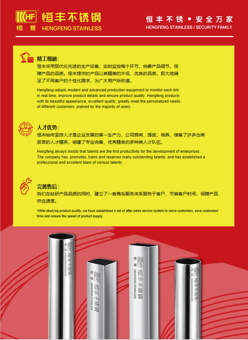 佛山市源恒丰不锈钢制品有限公司是广东省不锈钢材料与制品协会理事单位,其成立于1998年,是一家集生产、研发、设计、销售于一体的大型不锈钢管企业,专业生产 201#、304#、316#、316L# 不锈钢装饰焊管、不锈钢厚管、不锈钢水管、不锈钢工业管以及不锈钢制品管,现公司占地30000平方,拥有55条制管生产线,管材规格范围:6MM-219MM,厚度范围:024MM-4MM,旗下品牌有:“恒丰”304,“恒丰”YHF202A。