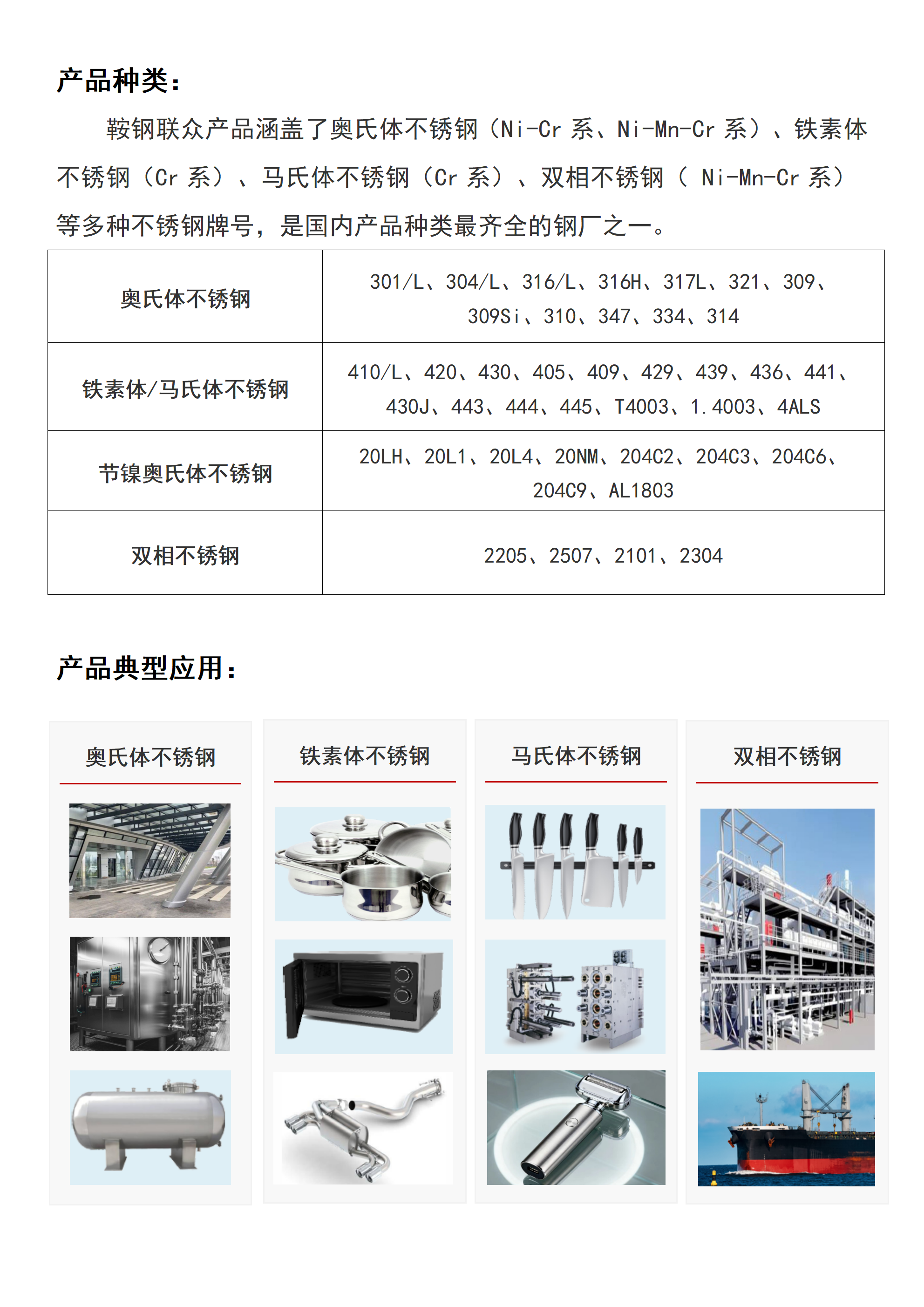 鞍钢联众产品涵盖了奥氏体不锈钢(Ni-Cr系、Ni-Mn-Cr系)、铁素体不锈钢(Cr系)、马氏体不锈钢(Cr系)、双相不锈钢( Ni-Mn-Cr系)等多种不锈钢牌号,是国内产品种类最齐全的钢厂之一。