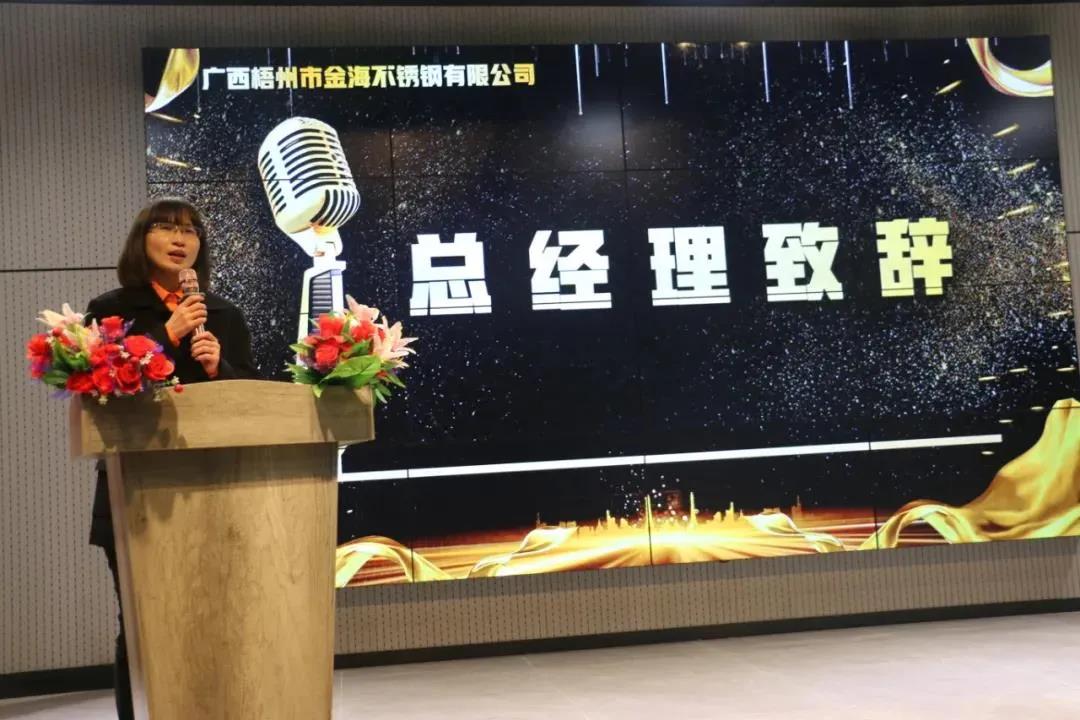 梧州金海总经理卢燕娴女士向优秀团队及优秀个人表示真挚祝贺和衷心感谢,2021年金海不锈钢,启动了金海历史上绝无仅有的四大技改工程,如此大规模、如此挑战性,是对金海铁军掌控大型工程的战斗力检验,在2021年我们也经历了限电限产、能耗双控的挑战,同时还受到新冠肺炎疫情对市场的持续影响,但金海铁军,克服种种困难,实现连续突破,从优秀到卓越,并持续超越,在工程及产值上均取得了历史性突破。将危机化转为机会,这就是金海铁军逆势而上的能力。