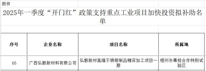 日前,广西壮族自治区工业和信息化厅公布2025年一季度“开门红”政策支持重点工业项目加快投资拟补助名单。据悉,广东省不锈钢材料与制品协会副会长单位广东金海辉煌集团旗下核心企业广西梧州市金海不锈钢有限公司、广西弘毅新材料有限公司,理事单位佛山市南海鹏定达金属制品有限公司兄弟企业广西贺州鹏达新材料有限公司均在列: