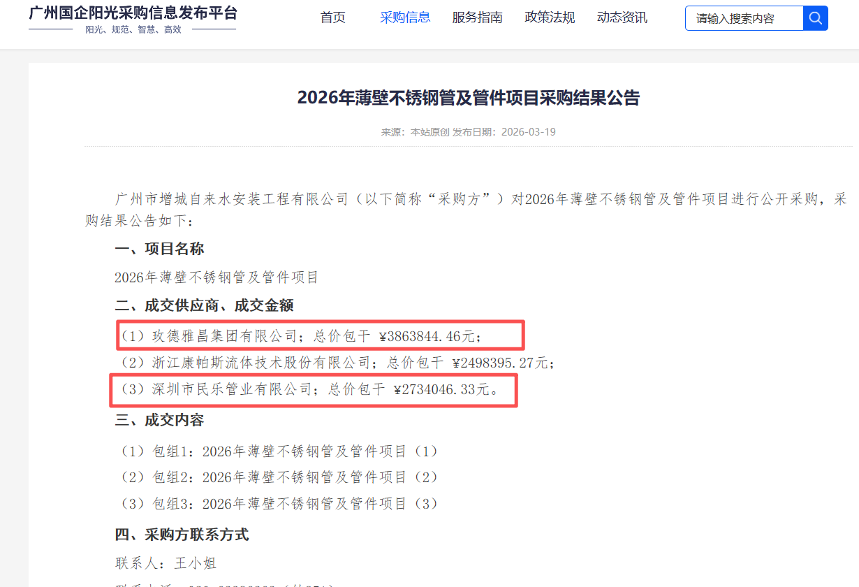 近日,广州市增城自来水安装工程有限公司2026年薄壁不锈钢管及管件项目采购结果公告已发布。据悉,广东省不锈钢材料与制品协会常务副会长单位深圳市民乐管业有限公司、理事单位玫德雅昌集团有限公司成功中标,具体如下: