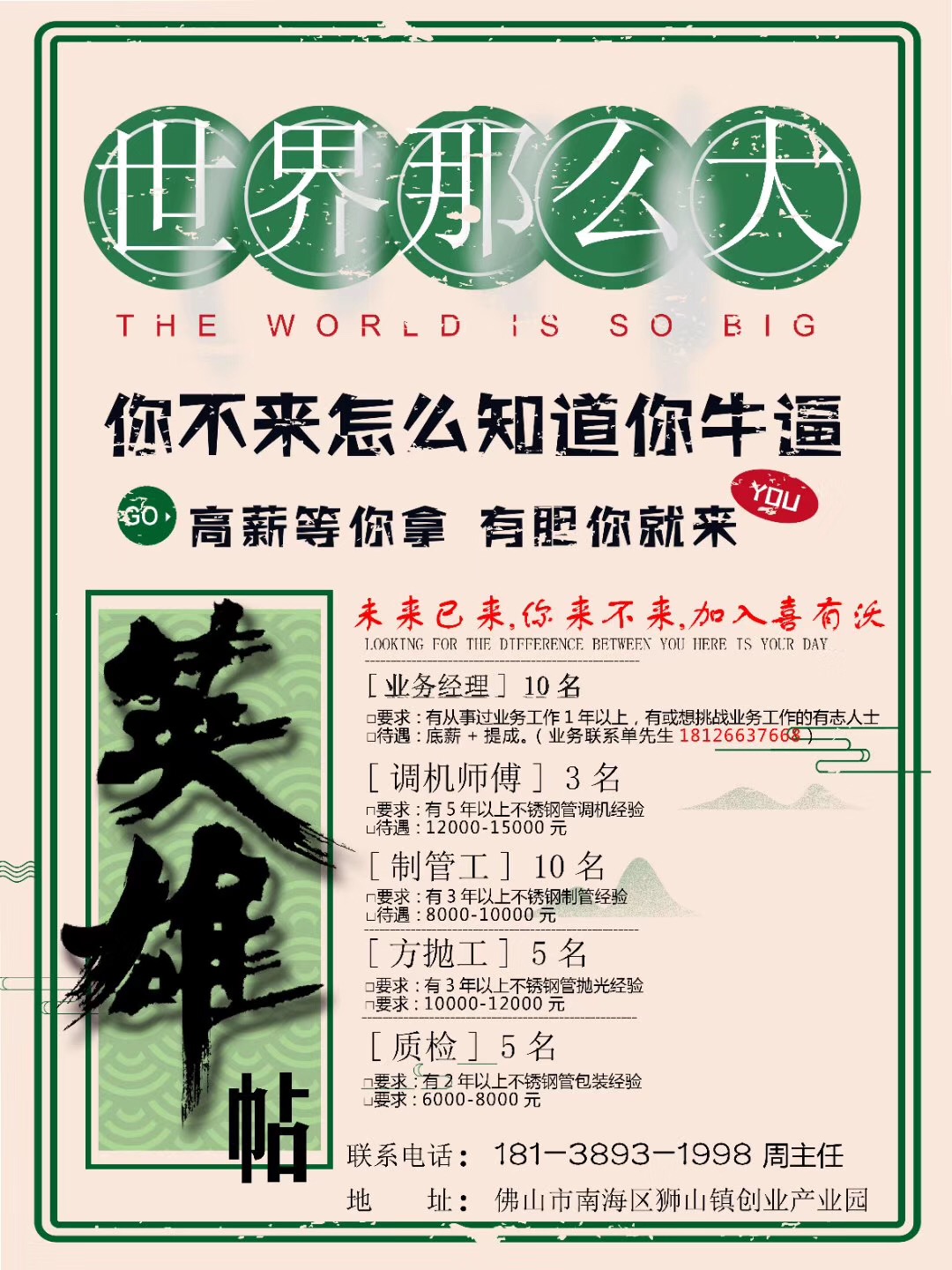 因业务发展需要,我会理事单位——佛山市南海区喜有沃不锈钢有限公司诚聘以下职位精英: