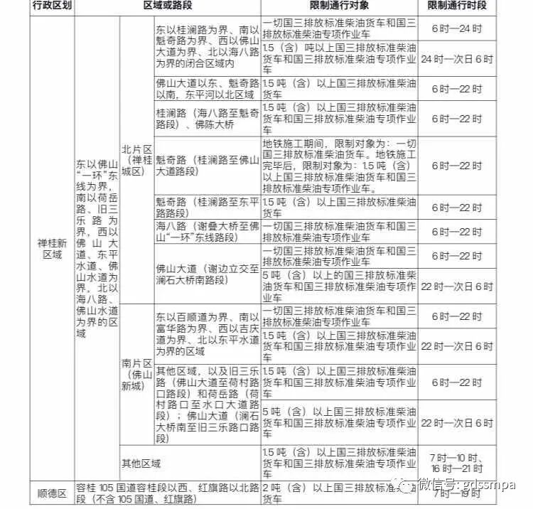 4月14日,《佛山市人民政府关于调整重点区域货车限制通行时间及实施国三排放标准柴油货车限制通行交通管理措施的通告》发布,根据通告,重点区域从7月1日起货车限制通行时段调整为6~24时,而国三排放标准柴油货车限制通行,通行范围、时段与中心城区货车限制通行范围、时段一致。
