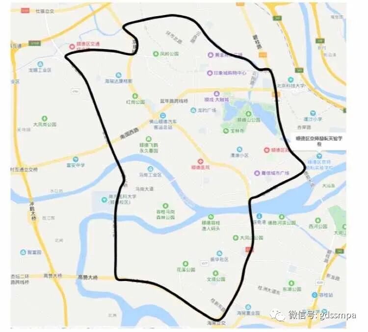 (二)顺德区限制通行范围。以碧桂路、德胜路、105国道、红旗路、伦桂路、顺翔路、凤翔路、105国道及桂畔海为边界的闭合区域(不含105国道、碧桂路、德胜路、伦桂路、红旗路)。