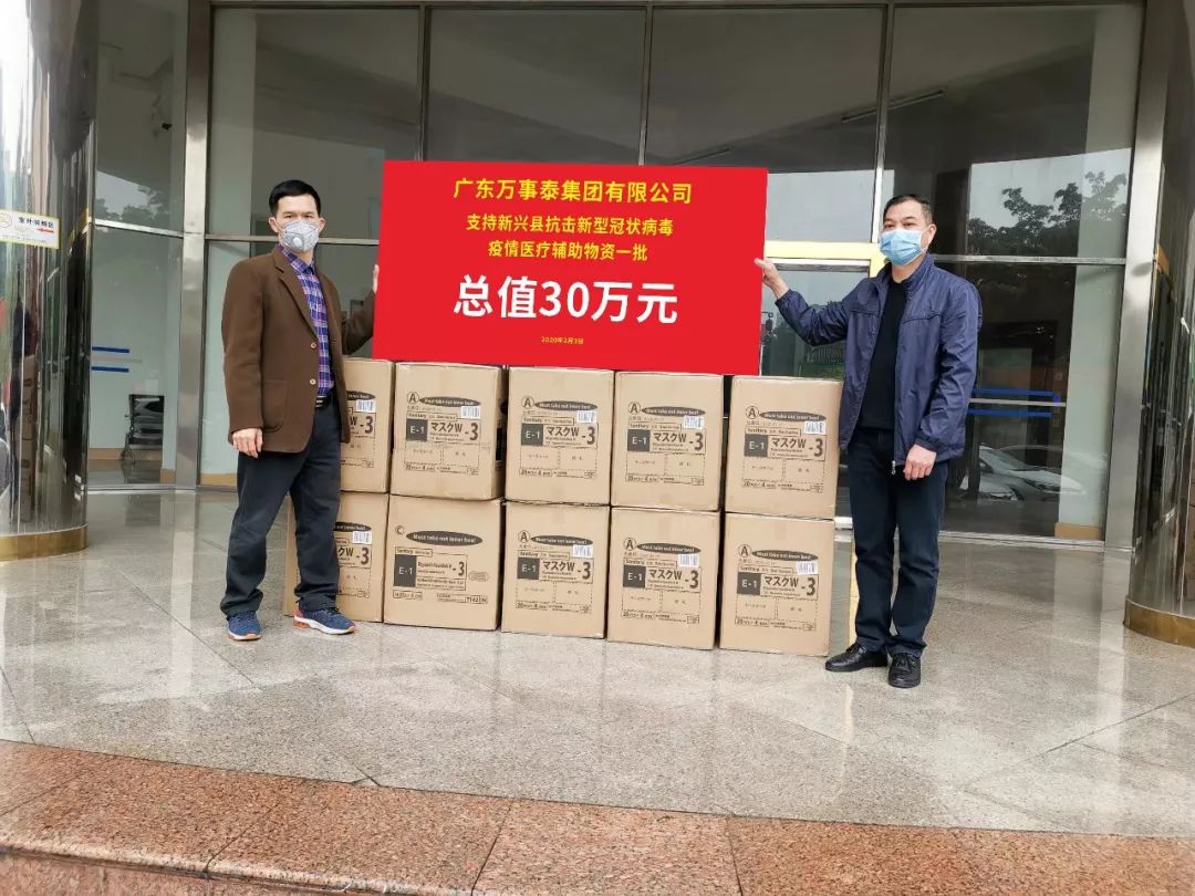 2月3日,广东万事泰集团以实际行动向新兴县人民政府捐款30万元防疫物资一批。此外,万事泰集团还向新兴县不锈钢商会捐赠5万元,以支援新兴县防控工作部门购买防控抗病毒急需物资之用。